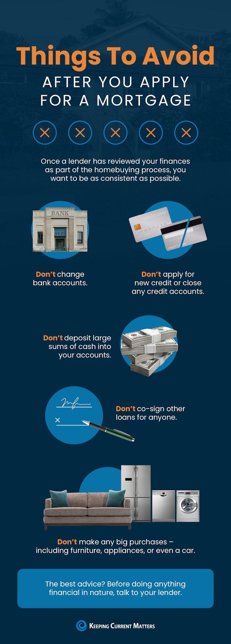 - Once a lender has reviewed your finances as part of the homebuying process, you want to be as consistent as possible. Don’t make any big changes that could affect your mortgage application.